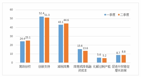 二季度,在列明的六大优惠政策选项中,政策惠及面最大的是对企业的创新支持,在上述3.4万家受益优惠政策的企业中,受益创新支持政策的企业比例达51.3%,比一季度略降1.1个百分点,比去年四季度提高5.3个百分点。