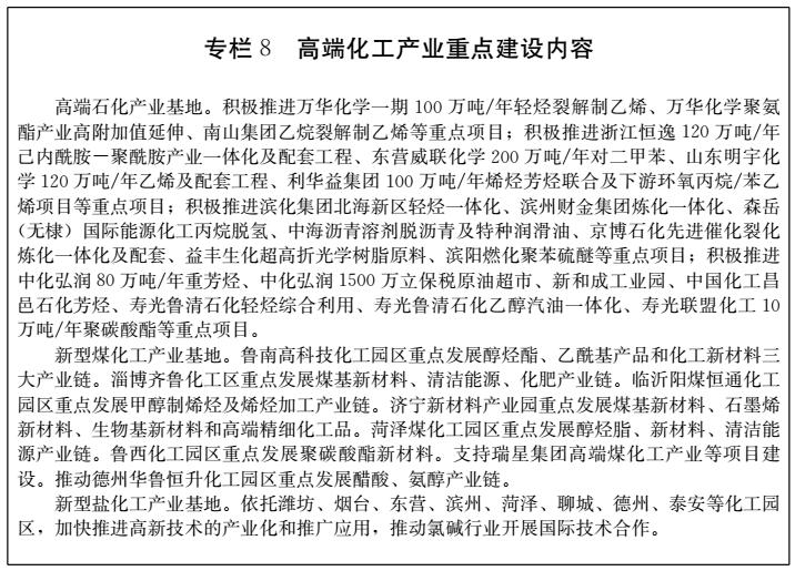 第六章 提升传统产业改造形成新动能 加快引用新技术新管理新模式,瞄准国际标准,推动传统产业腾笼换鸟、凤凰涅槃、浴火重生,焕发生机活力,促进全产业链整体跃升,打造世界级制造业集群,培育形成新动能基础力量。 第一节 高端化工产业 以基地化、链条化、智能化为方向,坚持创新、安全、环保、质效联动发展,加快优化产业布局和产品结构,建设高端化工产业强省。到2022年,高端化工产业增加值力争达到5100亿元,占地区生产总值的5.1%。 提升集约集聚发展水平。发挥产业基础和资源区位优势,巩固提升我省在国家化工产业战略布局中的地位。在东营、烟台、滨州、潍坊布局建设芳烃、乙烯等一批重大项目,建成国内领先、世界一流的高端石化产业基地。培育淄博、菏泽两大千亿级精深加工产业集群。依托济宁、枣庄、菏泽、泰安、临沂等煤化工产业园,打造鲁南国家级煤化工产业示范基地。依托潍坊、烟台、东营、泰安、滨州、菏泽等盐化工产业园,适度发展食品级、电子级盐化工,打造高端盐化工产业基地。完善化工园区产业升级与退出机制,全面推动散、乱、危、小化工企业进园入区,力争到2022年进园入区比例达到40%左右。利用清洁生产、智能控制等先进技术改造提升现有生产装置,降低消耗,减少排放,提高产品质量和综合效益。 加快炼化一体化步伐。坚持基础产业优化整合,加快向下游延伸,推动地炼产业由“一油独大”向“油化并举”转变。引导企业科学规划多元化技术生产路线,提高基础原料供应能力。整合提升地方炼化企业加工能力,支持骨干炼化企业构建循环产业链,开发生产石油炼化下游产品。加强石化产业产能和技术国际合作交流,打造面向世界的产业平台。 延伸拓宽产业链条。重点在特种橡胶、特种纤维、特种工程塑料、前沿新材料、高性能复合材料等领域,打造一批特色产业链。提升为电子信息及新能源产业配套的电子化学品工艺技术水平。发展用于水处理、传统工艺改造以及新能源用功能性膜材料。开发新型生物基增塑剂和可降解高分子材料。