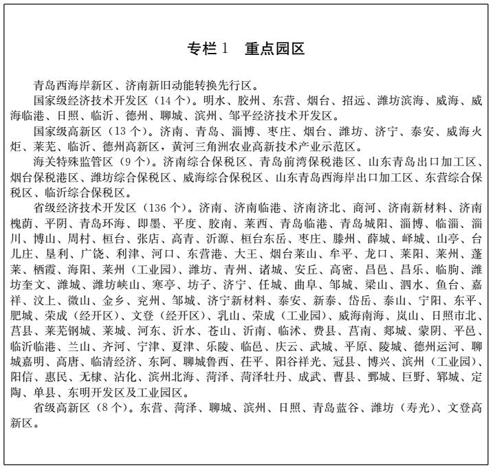 第三章 发展布局 按照国务院批复的山东新旧动能转换综合试验区(以下简称综合试验区)建设总体方案,综合试验区包括济南、青岛、烟台市全域,以及其他14个设区市的国家和省级经济技术开发区、高新技术产业开发区以及海关特殊监管区。本规划范围以综合试验区为重点,覆盖全省陆域和近海海域。坚持梯次扩散与节点辐射相结合,全面推进与集中集约相协调,加快形成“三核引领、多点突破、融合互动”的新旧动能转换总体布局。 第一节 三核引领 充分发挥济南、青岛、烟台市经济实力雄厚、创新资源富集等综合优势,率先突破辐射带动,打造新旧动能转换主引擎。 济南:实施北跨东延、携河发展,在黄河沿岸高起点、高标准、高水平规划建设国家新旧动能转换先行区,集聚集约创新要素资源,发展高端高效新兴产业,打造开放合作新平台,创新城市管理模式,综合提升基础设施和公共服务水平,建设现代绿色智慧新城。以新旧动能转换先行区为引领,以东部高端产业集聚区、省级开发区转换提升区、泉城优化升级区为支撑,以济南中央商务区、济南国际医学科学中心为重点,构建“一先三区两高地”的核心布局。重点发展大数据与新一代信息技术、智能制造与高端装备、量子科技、生物医药、先进材料、产业金融、现代物流、医养健康、文化旅游、科技服务等产业,提高省会城市首位度,建设“大、强、美、富、通”的现代化省会城市,构建京沪之间创新创业新高地和总部经济新高地,打造全国重要的区域性经济中心、金融中心、物流中心和科技创新中心。 青岛:突出海洋科学城、战略母港城、国际航运枢纽和国家沿海重要中心城市综合功能,以青岛西海岸新区、蓝谷核心区、高新区、胶东临空经济示范区为引领,以胶州湾青岛老城区有机更新示范带和胶州、平度、莱西等县域经济转型升级示范园区为支撑,构筑“四区一带多园”的核心布局。重点打造新一代信息技术、轨道交通、智能家电、海洋经济、高端软件、生物医药、航空航天、航运物流、财富金融、影视文化、时尚消费等国内外领先的产业集群,大力发展平台经济、分享经济、标准经济、绿色经济等引领潮流的新业态新模式。积极创造条件探索建设自由贸易港,打造国际先进的海洋发展中心、国家东部沿海重要的创新中心、国家重要的区域服务中心和具有国际竞争力的先进制造业基地,提升全省经济发展的龙头地位,争创国家中心城市,打造国际海洋名城,形成国家东部地区优化发展的增长极,建设更加富有活力、更加时尚美丽、更加独具魅力的青岛。 烟台:发挥环渤海地区重要港口城市、先进制造业名城、国家创新型试点城市优势,强化中心城区引领作用,以烟台经济技术开发区、烟台高新技术产业开发区、蓬长协作联动发展区为重点,以烟台东部产城融合发展示范区、招远经济技术开发区、中心城区功能与产业更新带、国家现代农业产业园为支撑,形成“五区一带一园”的核心布局。重点发展海洋经济、高端装备、信息技术、生物医药、高端石化、先进材料、航空航天、金融商务、医养健康、文化旅游、高效农业等产业,打造先进制造业名城、国家海洋经济发展示范区、国家科技创新及成果转化示范区和面向东北亚对外开放合作新高地。 第二节 多点突破 以淄博等14市国家和省级经济技术开发区、高新技术产业开发区以及海关特殊监管区等为重点,创新园区管理运营机制,明确各市产业发展方向,培育特色经济和优势产业,打造若干具有核心竞争力的区域经济增长点。 淄博:布局新能源电池及新能源汽车、智能卡及微机电等未来产业,壮大新材料、生物医药、信息技术、文化旅游、现代金融等新兴产业,改造化工、陶瓷、纺织等传统产业,淘汰建材、钢铁等行业落后产能,打造全国老工业城市和资源型城市产业转型升级示范区、新型工业化强市、齐文化传承创新示范区。 枣庄:布局人工智能等未来产业,壮大信息技术、新能源、新材料、医养健康等新兴产业,改造化工、机械机床、煤电、建材等传统产业,淘汰平板玻璃、水泥等行业落后产能,打造智慧枣庄和资源型城市创新转型持续发展示范区、国家可持续发展议程创新示范区。 东营:布局航空航天服务等未来产业,壮大石化装备、新能源、文化旅游等新兴产业,改造化工、冶金、造纸、纺织等传统产业,淘汰炼油、轮胎等行业落后产能,打造绿色循环高端石化产业示范基地和石油资源型城市转型发展试验区。 潍坊:布局虚拟现实、人工智能、新能源电池等未来产业,壮大高端装备制造、生物基材料、信息技术、现代种业等新兴产业,改造装备制造、汽车、化工等传统产业,淘汰钢铁、造纸等行业落后产能,打造国家农业开放发展综合试验区、虚拟现实产业基地和国际动力城。 济宁:布局第三代半导体、生命健康等未来产业,壮大信息技术、文化旅游、生物医药等新兴产业,改造工程机械、能源、纺织服装等传统产业,打造优秀传统文化传承发展示范区和资源型城市新旧动能转换示范区。 泰安:布局人工智能、生命健康、信息技术等未来产业,壮大高端装备制造、文化旅游体育、新能源等新兴产业,改造建材、化工、纺织等传统产业,打造彰显泰山魅力的国际著名旅游目的地城市和智能绿色低碳发展示范区。 威海:布局生命健康